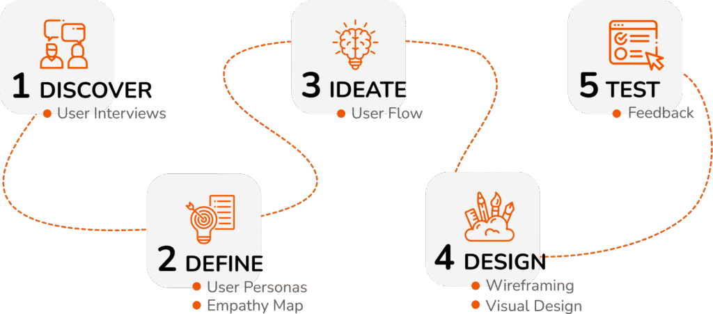 The design phase begins with Discover, where user interviews help gather insights. In Define, user personas and empathy maps are created to clarify needs. Ideate focuses on developing user flows, followed by Design, which involves wireframing and visual design. Finally, Test gathers feedback to refine the solution.